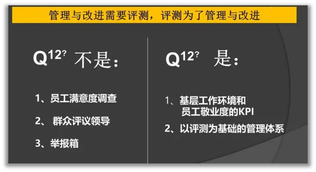 盖洛普Q12测评法是针对前导指标中员工敬业度和工作环境的测量,发现12个关键问题最能反映员工的保留、利润、效率和顾客满意度的四个硬指标。